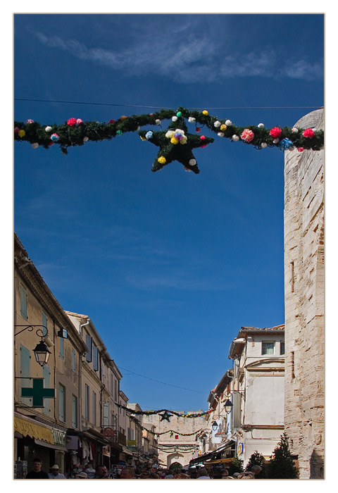 Die Weihnachtsdeko hängt im Juni noch als Girlanden in den Gässchen