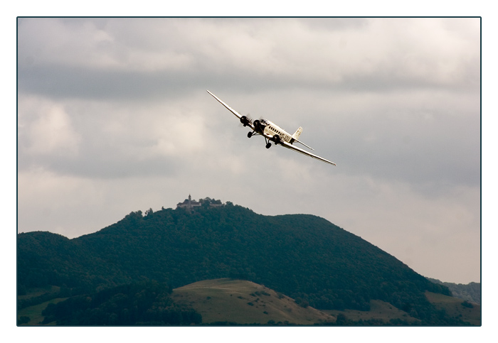 Junkers Ju 52 D-AQUI D-CDLH im Landeanflug. Im Hintergrund die Burg Teck