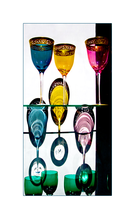 Glaswaren mit Spiegelungen in einem Schaufenster auf Murano