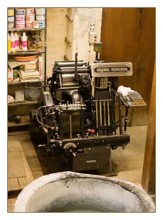 Original Heidelberg-Maschinen im Papierfabrik-Museum, Fontaine de Vaucluse, Provence-Alpes-Côte d’Azur