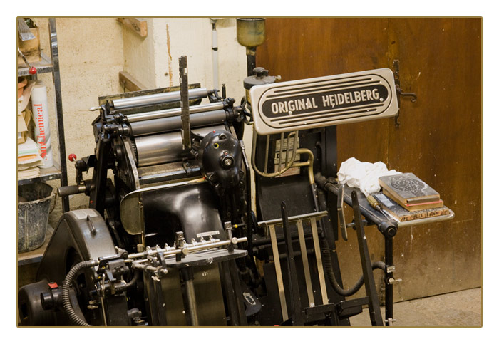 Original Heidelberg-Maschinen im Papierfabrik-Museum, Fontaine de Vaucluse, Provence-Alpes-Côte d’Azur