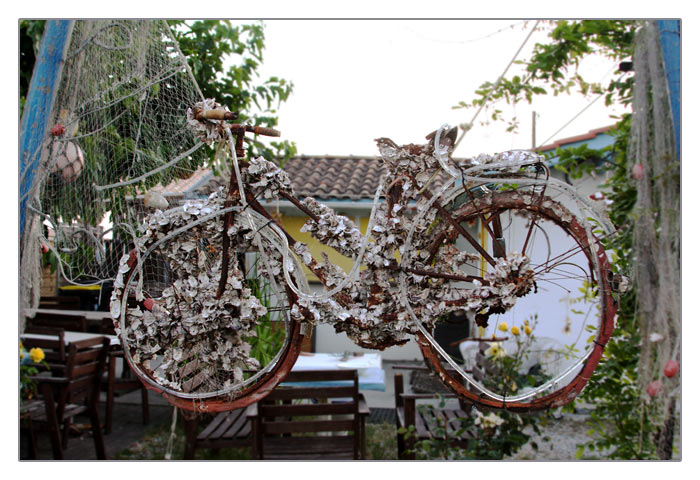 Fahrrad mit Austernschalen in Andernos-les-Bains, am Bassin von Arcachon
