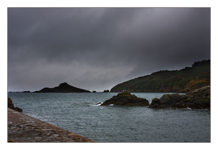 mit Blick auf den kleinen Yachthafen Gwin Zegal mit pechschwarzen Wolken und Regen.